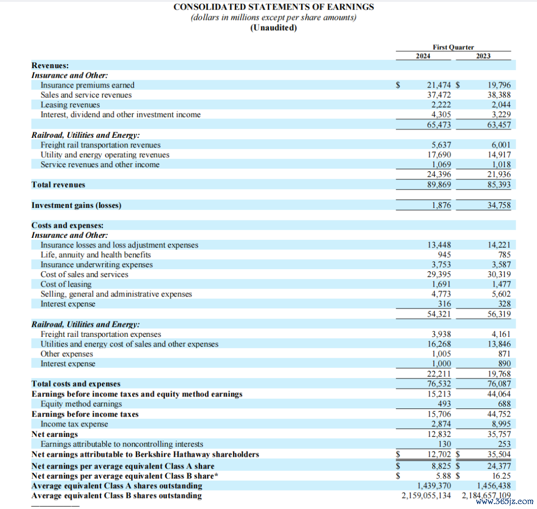 伯克希尔哈撒韦在股东大会问答环节开幕之前,发布了2024年第一季度财报。2024年一季度,伯克希尔营收(包括该公司来自上市公司的投资收益)898.69亿美元,同比增长5.2%,高于市场预期的859.2亿美元,上年同期为853.93亿美元;净利润达127.02亿美元,同比下降64.2%,市场预期为98.92亿美元,上年同期为355.04亿美元。